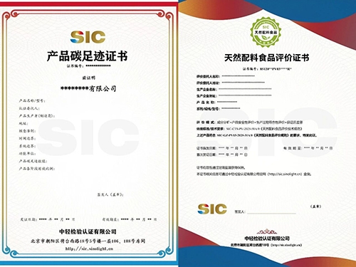 中輕檢驗(yàn)頒發(fā)的《產(chǎn)品碳足跡證書(shū)》《天然配料食品評(píng)價(jià)證書(shū)》