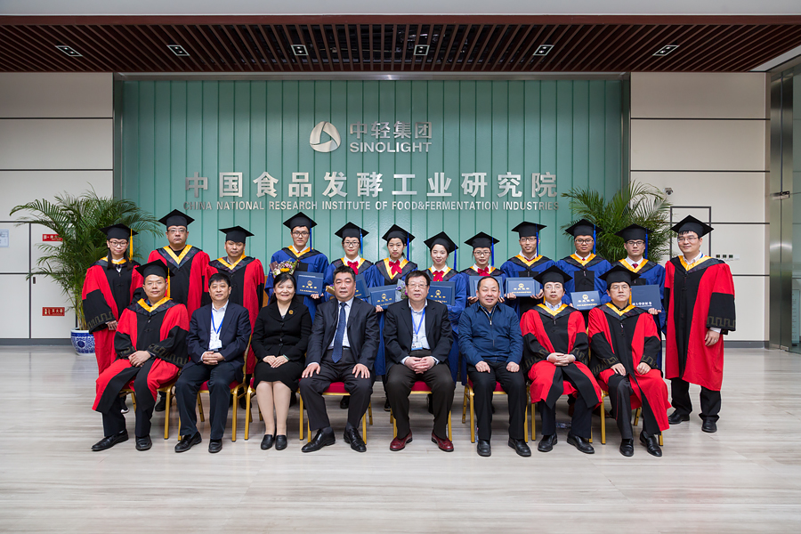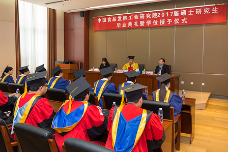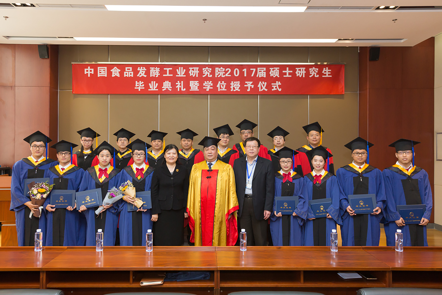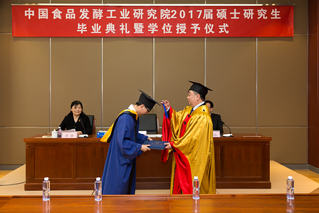 畢業(yè)典禮暨學(xué)位授予儀式在莊嚴(yán)的國(guó)歌聲中開始。隨后,王潔副書記宣讀了中國(guó)食品發(fā)酵工業(yè)研究院關(guān)于授予尹曼等8位同學(xué)工學(xué)碩士學(xué)位的決定。蔡木易院長(zhǎng)在莊嚴(yán)而歡快的音樂(lè)聲中,為8位學(xué)位獲得者頒發(fā)畢業(yè)證書和學(xué)位證書,祝賀他們?nèi)〉玫某煽?jī),并為學(xué)子們“撥穗”,合影留念。
