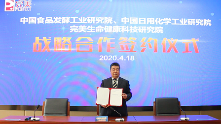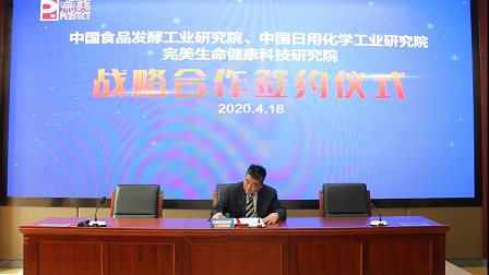 4月18日,食品院、日化院與完美生命健康科技研究院舉行戰(zhàn)略合作簽約儀式,儀式由中國(guó)輕工集團(tuán)有限公司副總經(jīng)理、食品院黨委副書記、董事長(zhǎng)、日化院董事長(zhǎng)蔡木易,完美(中國(guó))有限公司董事長(zhǎng)古潤(rùn)金在云端完成簽約儀式,完美生命健康科技研究院名譽(yù)院長(zhǎng)徐華鋒,食品院副院長(zhǎng)魯軍、段盛林,功能肽研發(fā)部主任谷瑞增全程參與見證。