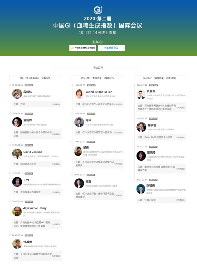10月12-14日,第二屆中國 GI(血糖生成指數(shù))國際會(huì)議以線上直播形式與大家見面,吸引了上萬人觀看,反響熱烈!自2019年9月,第一屆中國GI(血糖生成指數(shù))國際會(huì)議在食品院召開,獲得了行業(yè)強(qiáng)烈反響。今年,中國食品院與熱心腸研究院再度合作,舉辦第二屆中國 GI(血糖生成指數(shù))國際會(huì)議。