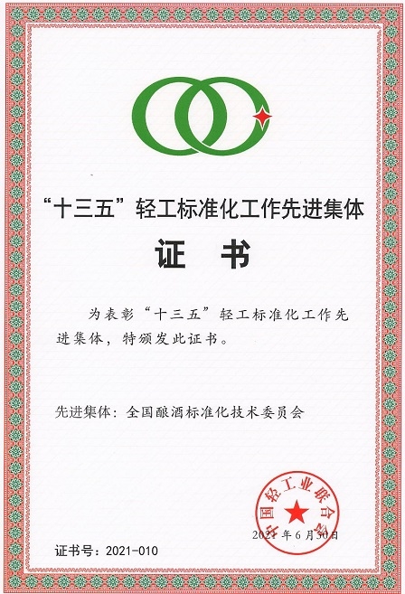7月6日,中國輕工業聯合會在北京召開“2021年度全國輕工行業標準化工作會議”,會上聯合會領導通報了“十三五”輕工標準化工作情況,宣讀了 “十三五”期間標準化工作表現突出的先進集體表彰文件。中國食品發酵工業研究院及全國釀酒標準化技術委員會雙雙榮獲“十三五”輕工標準化工作先進集體榮譽稱號。