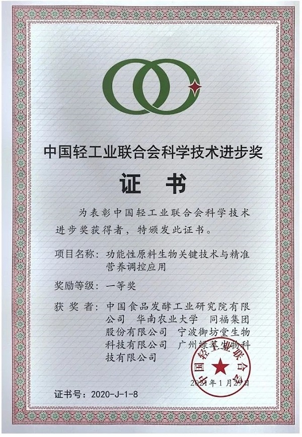 在2021年7月18日召開的中國輕工業聯合會第五次會員代表大會暨中華全國手工業合作總社第八次代表大會上,中國食品發酵工業研究院有限公司《功能性原料生物關鍵技術與精準營養調控應用》項目成果榮獲2020年度中國輕工業聯合會科學技術進步一等獎。