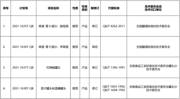 為進一步做好上述4項輕工行業標準的制修訂工作,全國釀酒標準化技術委員會秘書處、全國食品工業標準化技術委員會罐頭秘書處將按照相關規定,公開征集起草單位,并在標準起草過程中加強與相關單位的協調,廣泛征求意見,確保標準質量,按要求完成標準制修訂任務。