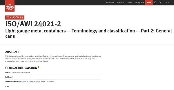 2021年11月26日,由我國主導的第2項薄壁金屬容器領域術語國際標準《薄壁金屬容器-術語和分類-第2部分:通用罐》(ISO/AWI 24021-2)成功立項,通用罐金屬容器方向為首項國際標準。項目研究制定周期為36個月,并計劃于2025年正式發布。