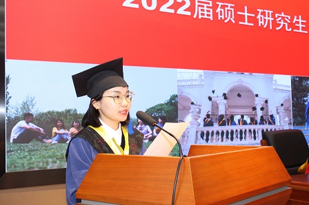 畢業生張哲同學代表全體畢業生向研究院、向辛勤培育學子的老師表達了衷心的感謝并致以崇高的敬意,表示在研究院里度過了充實而難忘的三年,經歷了研究院面對新冠疫情持續推動科技創新和服務行業的堅守;畢業后走向社會和工作崗位,全體同學一定會銘記研究院恩情和恩師的諄諄教誨,開啟嶄新的人生旅程。