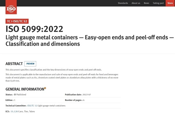 2022年7月29日,由中國(guó)食品發(fā)酵工業(yè)研究院有限公司和廣東英聯(lián)包裝股份有限公司等單位聯(lián)合主導(dǎo)研制的ISO 5099:2022 Light gauge metal containers—Easy-open ends and peel-offends—Classification and dimensions《薄壁金屬容器-易開蓋和易撕蓋-分類和尺寸》國(guó)際標(biāo)準(zhǔn)正式發(fā)布。該標(biāo)準(zhǔn)是我國(guó)承擔(dān)國(guó)際標(biāo)準(zhǔn)化組織薄壁金屬容器技術(shù)委員會(huì)(ISO/TC52)秘書處以來,主導(dǎo)完成的首項(xiàng)國(guó)際標(biāo)準(zhǔn)。