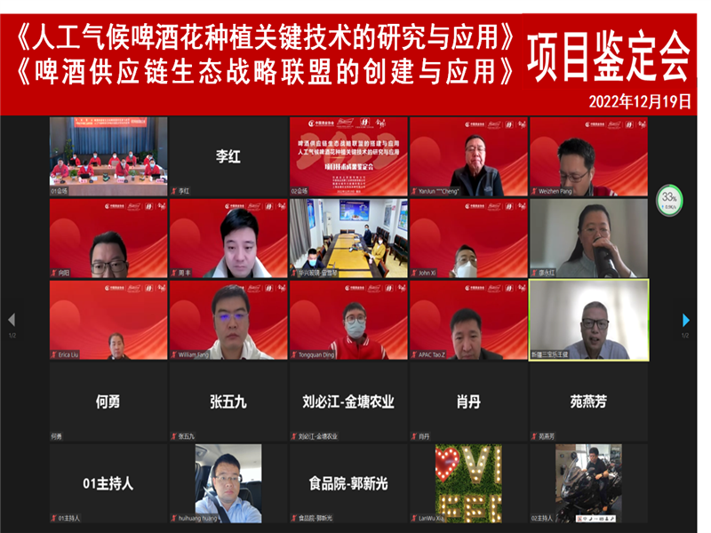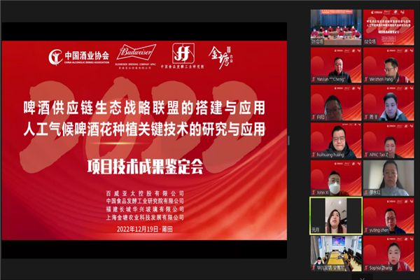 2022年12月19日,由百威亞太控股有限公司和中國食品發(fā)酵工業(yè)研究院有限公司合作完成的“啤酒供應鏈生態(tài)戰(zhàn)略聯(lián)盟的創(chuàng)建與應用”和“人工氣候啤酒花種植關(guān)鍵技術(shù)的研究與應用”兩個項目通過了由中國酒業(yè)協(xié)會組織的科技成果鑒定,鑒定委員會一致認為這兩個項目成果均為國內(nèi)首創(chuàng),技術(shù)水平達到國際領(lǐng)先水平。