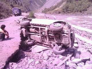 彭云:有天中午,我們從夾壁鄉衛生院巡查完趕去另一個工地,兩個工地之間有一段未完工的317國道路基。受地震影響,道路遭受嚴重的破壞,兩邊山上時有滾石掉下。車在顛簸、搖晃中緩慢行駛,過了畢棚溝路口的小橋后是一個急轉彎。突然,前面從山上滾下一根木頭橫在車前,司機劉定峰大喊一聲“壞了!”,瞬間車子跳起來,劇烈搖晃,我下意識抱住了頭,身體在車內左右撞擊,周圍的東西在搖晃,車在旋轉,十幾秒鐘以后,一切戛然停止。我們又怔了十幾秒,“大家沒事吧?”我們異口同聲問道,我試著動了動四肢,沒受傷,其他人也都沒有受傷。在附近目睹這驚險場面的工友們全部跑過來拉我們出去。從車子里出來后,我們發現側翻車輛離河邊只有兩米!也要感謝劉定峰,在車摔到坑里前他死死的抓住方向盤,踩著剎車,避免了更大的險情發生。