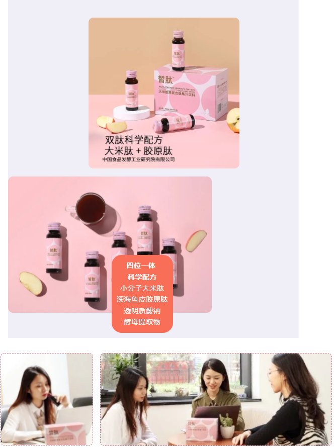 “皙肽”系列產品由保利中輕所屬中國食品研究院自主研發生產,大米膠原復合肽果汁飲料以大米肽和自有專利提取的深海魚皮膠原肽為核心原料,雙肽科學配方,解決肌膚暗沉、干燥粗糙、彈性降低等肌膚問題,經過專業檢測認證,安全放心;中國食品研究院專家團隊匠心研發,經過長期追蹤試飲反饋,肌膚問題明顯改善。