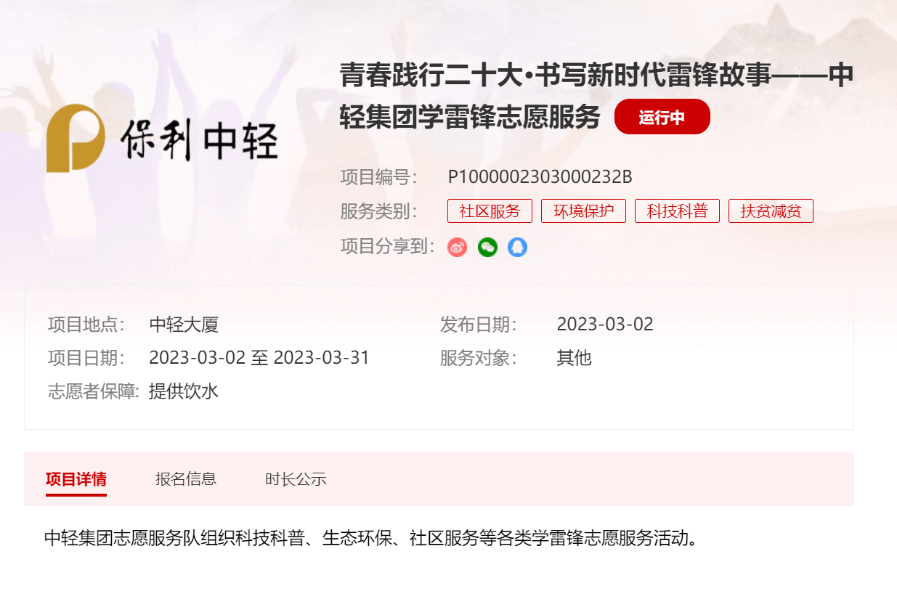保利中輕總部組織建立青年志愿服務隊,牽頭開展學雷鋒系列主題活動。指導廣大團員青年進行注冊并加入團隊,號召廣大團員青年立足崗位、敬業奉獻,接續傳承服務人民、助人為樂的雷鋒精神。