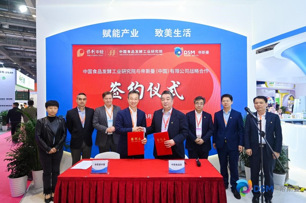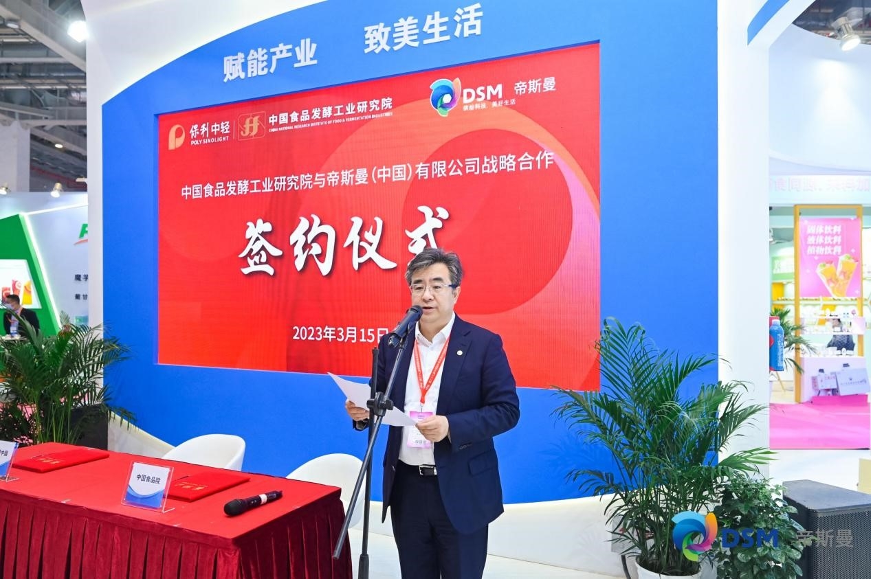 展會期間,中國食品發酵工業研究院與帝斯曼(中國)有限公司舉行“營養健康原料標準化聯合研究中心”戰略合作簽約儀式。安勝杰表示,雙方將發揮帝斯曼集團在健康、營養和生物科學領域等方面的核心技術優勢,以及中國食品發酵工業研究院在食品發酵行業質量安全保障、成果產業化、產品研發資源等方面的行業積淀,實現創新發展、互惠互利,共同推動食品產業標準化水平和質量安全的全面提升。