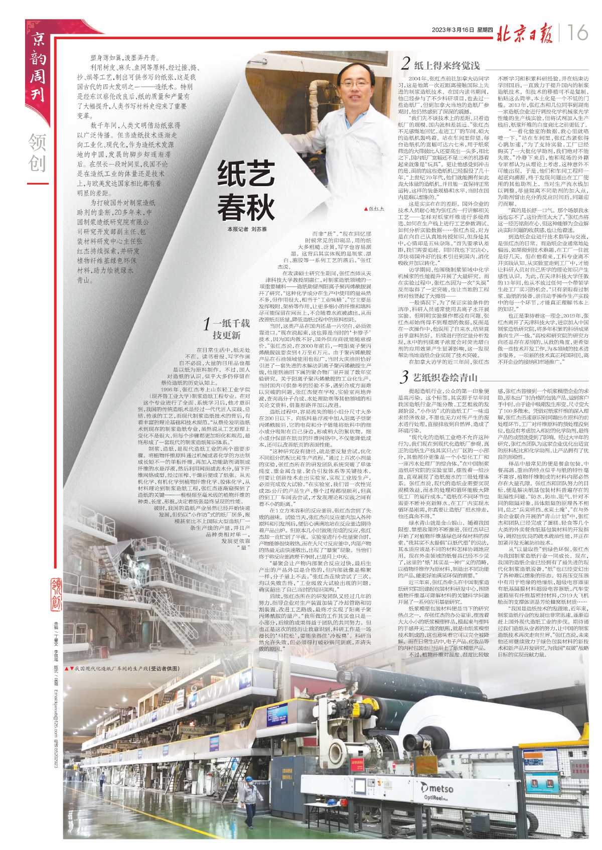 2023年3月16日,《北京日報》“京韻周刊·領創”專欄以《紙藝春秋》為題,刊發保利中輕所屬中國制漿造紙研究院研究開發部副主任、包裝研發中心主任張紅杰及其團隊,為打破國外對制漿造紙助劑的壟斷,持續研發植物纖維基綠色環保材料,助力繪就綠水青山的故事。與大家分享——