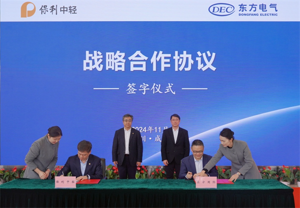 11月19日,保利中輕與東方電氣集團國際合作有限公司(簡稱“東方國際”)在蓉簽署戰略合作協議。保利集團總經理助理,保利中輕黨委書記、董事長安勝杰;東方電氣股份有限公司副總裁,東方國際黨委書記、董事長李建華出席儀式見證簽約。