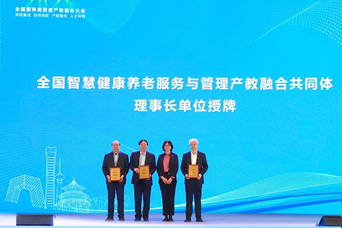 北京市教委二級巡視員楊江林、北京市民政局二級巡視員白玲為“全國智慧健康養老服務與管理產教融合共同體”揭牌。