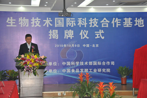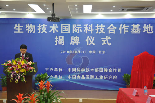 揭牌儀式上,靳曉明司長和陳鄂生董事長分別致辭。靳司長指出,科技的靈魂在于開放,食品行業作為國民經濟的重要支柱產業,技術的進步離不開國際合作。希望以設立生物技術“國際科技合作基地”為契機,積極參加國際科技合作交流活動,充分利用國際資源,進一步挖掘潛力,引進高級人才,使基地真正成為“技術領先、人才聚集”的國際科技創新中心。陳董事長要求,食品發酵院要深刻領會科技部《“十一五”國際合作規劃綱要》精神,緊密圍繞建設創新型國家的總體目標,切實提高自主創新能力,建設“項目基地人才”一體化的國際科技研發高地。蔡院長代表基地建設單位發表講話。