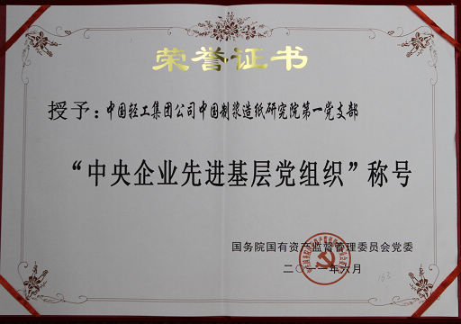 中國輕工集團公司中國制漿造紙研究院第一黨支部七一前夕榮獲國資委“中央企業先進基層黨組織”榮譽稱號。