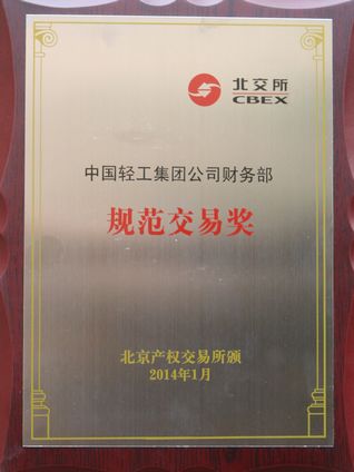2014年1月北京產權交易所對25家國有產權交易規范操作的央企進行表彰,中輕集團財務部獲規范交易獎。
