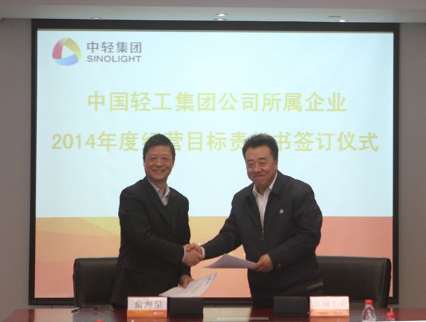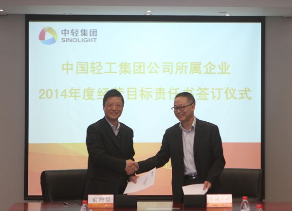 集團(tuán)公司總經(jīng)理俞海星在儀式上代表集團(tuán)公司與所屬11家二級(jí)企業(yè)主要負(fù)責(zé)人簽訂了2014年度經(jīng)營(yíng)目標(biāo)責(zé)任書。