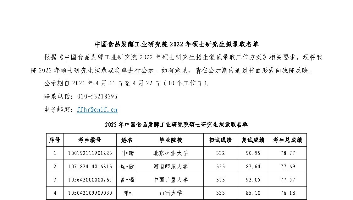 中國食品發(fā)酵工業(yè)研究院2022年碩士研究生擬錄取名單