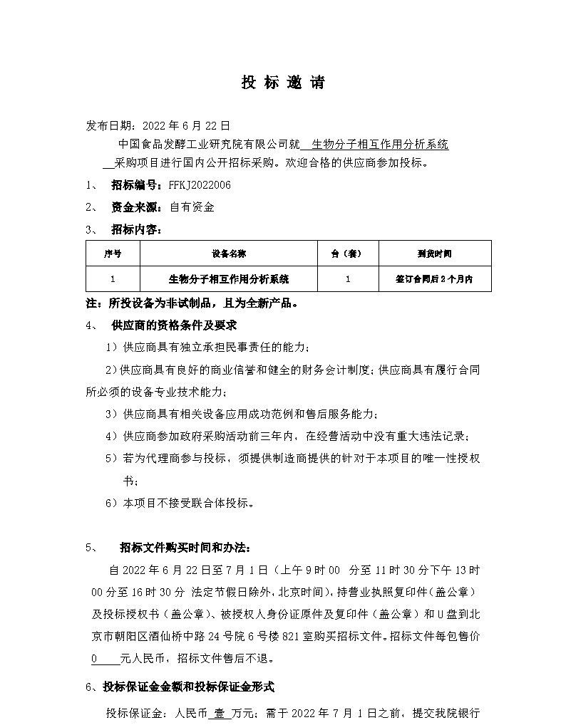 生物分子相互作用分析系統采購項目(FFKJ2022006)國內公開招標采購