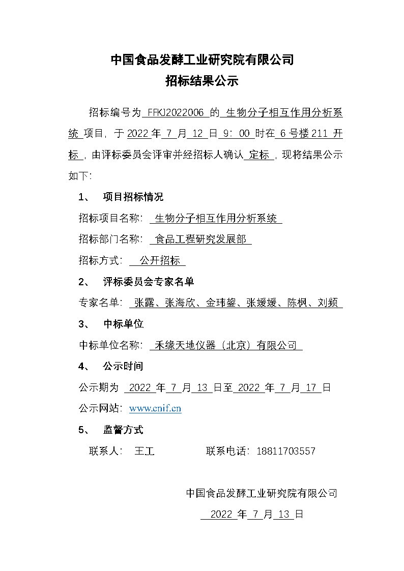 招標(biāo)結(jié)果公示——生物分子相互作用分析系統(tǒng)(招標(biāo)編號:FFKJ2022006)