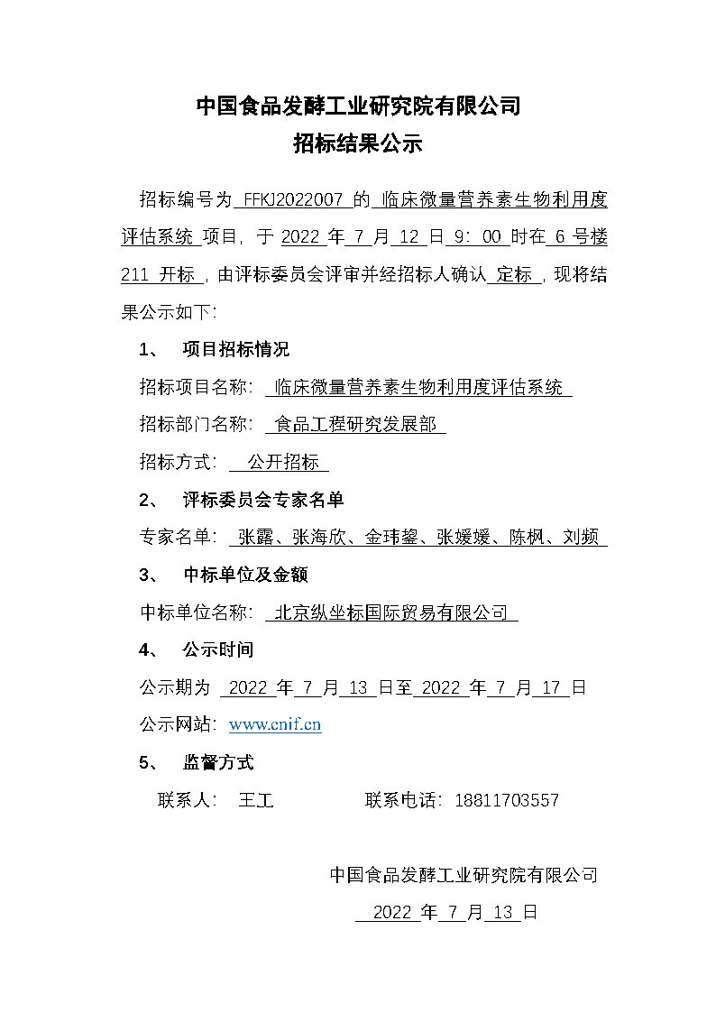 招標結果公示——臨床微量營養素生物利用度評估系統(招標編號:FFKJ2022007)