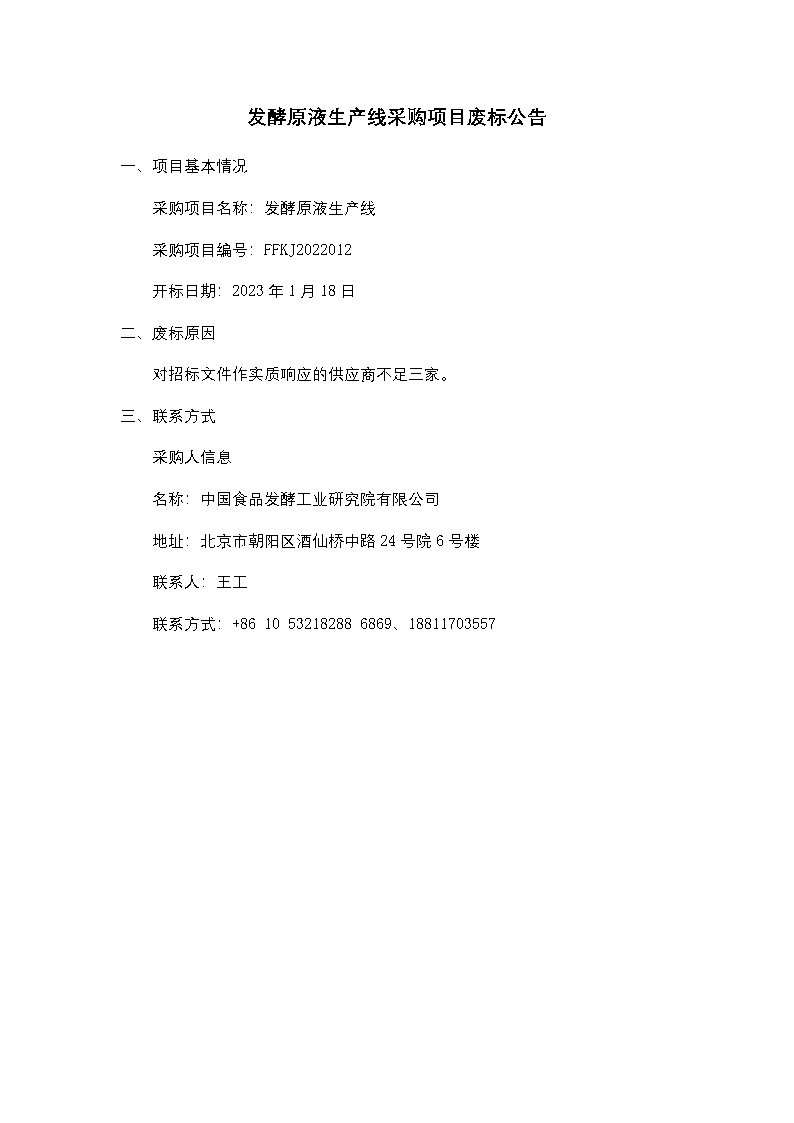 發酵原液生產線采購項目廢標公告