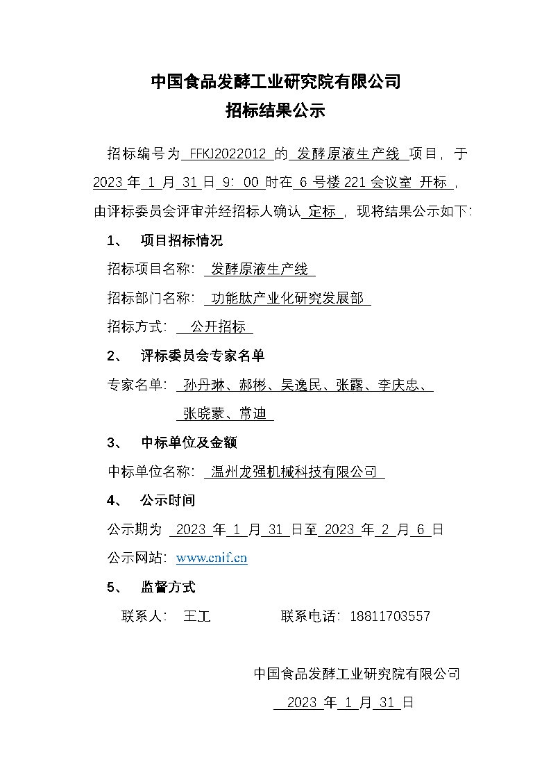 招標結果公示——發酵原液生產線(招標編號:FFKJ2022012)