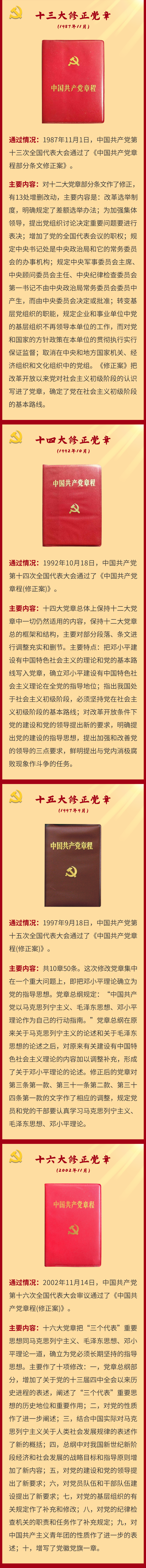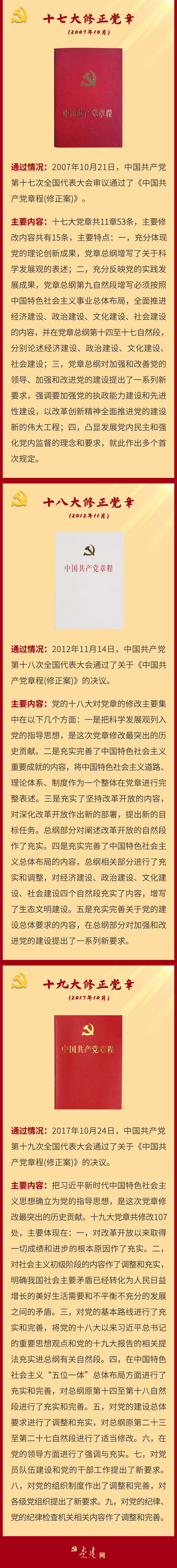 黨的全國代表大會根據黨的理論創新和實踐發展的需要對黨章進行修改,是我們黨的一個慣例。黨的二十大的一項重要任務,就是根據新形勢新任務對現行黨章進行適當修改,以更好發揮黨章對黨的工作和黨的建設的指導、規范作用。黨建網依據相關材料整理了黨章歷次制定與修正的“極簡史”,邀您一起學習了解。