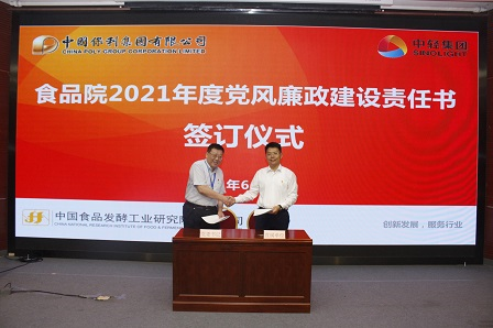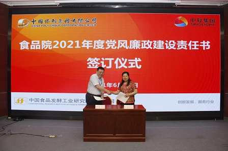 會上,黨委書記董偉紅、總經理董建輝分別向獲得保利“2020年度基層示范黨支部”的發酵國合黨支部、“2021年先進基層黨組織”的食品釀酒黨支部頒發了榮譽獎牌和證書。董偉紅分別與食發科貿、中食發科技和中食公司3家直屬單位簽訂2021年黨風廉政建設責任書。